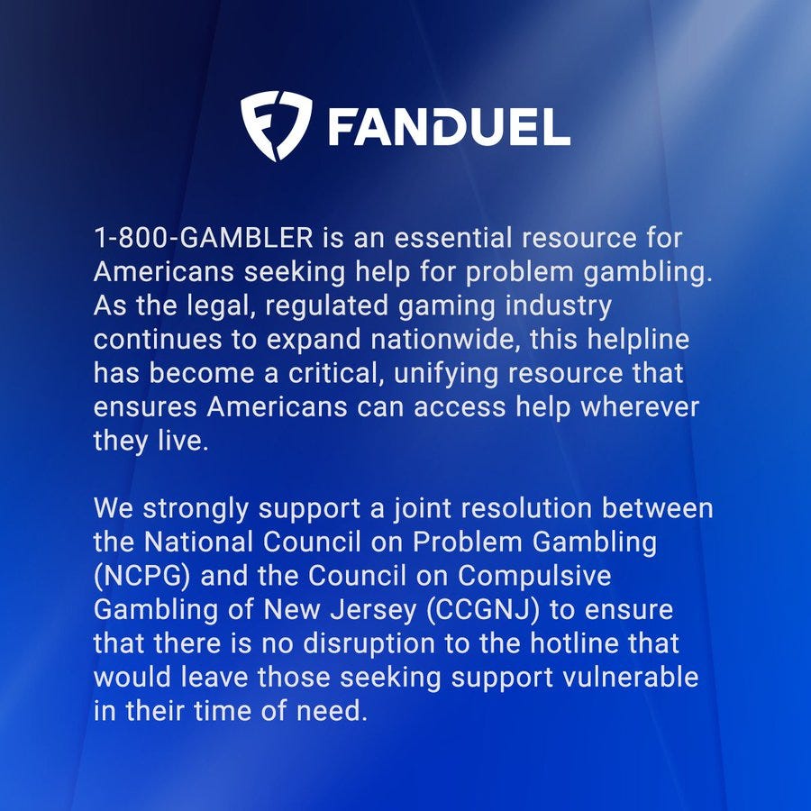 FanDuel offered a statement on the ongoing consternation over who will operate the 1-800-GAMBLER hotline: