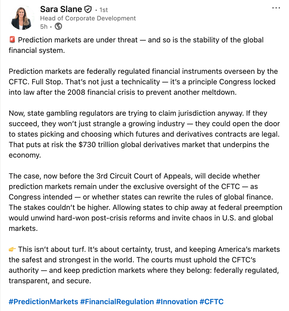 Every time I think the rhetoric from Kalshi and prediction markets has reached an all-time high, they find a way to outdo themselves. Kalshi’s head of corporate development, Sara Slane, posted this on LinkedIn: