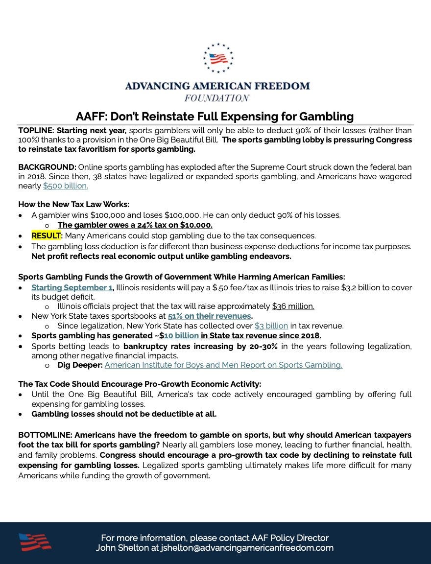 BOTTOMLINE: Americans have the freedom to gamble on sports, but why should American taxpayers foot the tax bill for sports gambling? Nearly all gamblers lose money, leading to further financial, health, and family problems. Congress should encourage a pro-growth tax code by declining to reinstate full expensing for gambling losses. Legalized sports gambling ultimately makes life more difficult for many Americans while funding the growth of government.