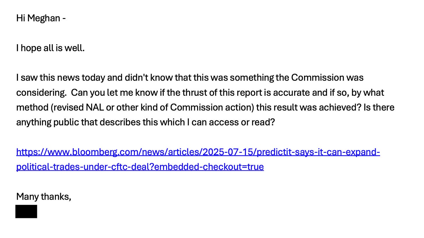 Another email from TCL’s FOI request, dated July 15, indicates that Quintenz was asking about the CFTC’s actions allowing PredictIt to expand its prediction markets offering.